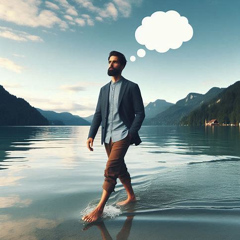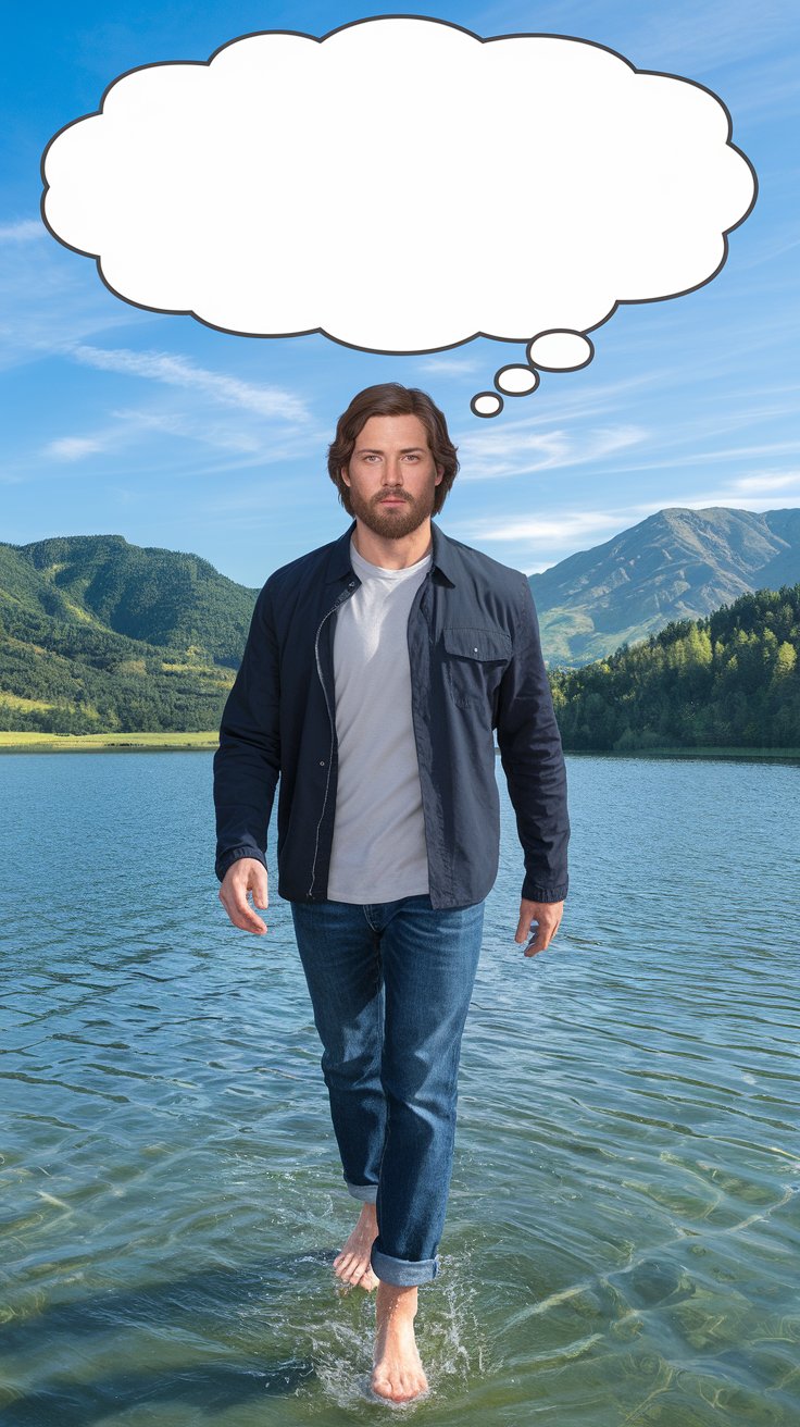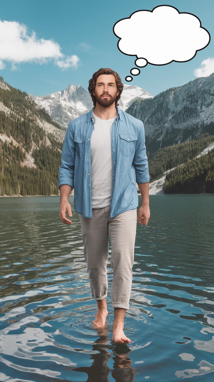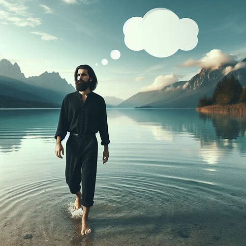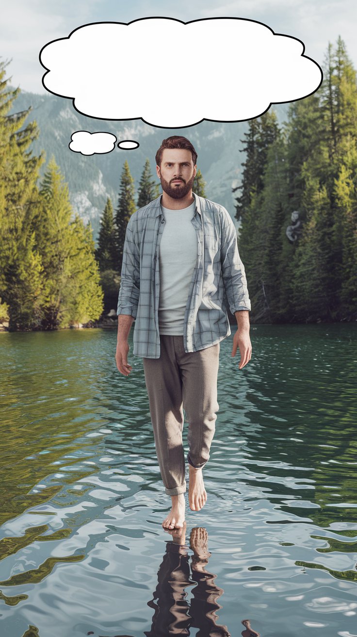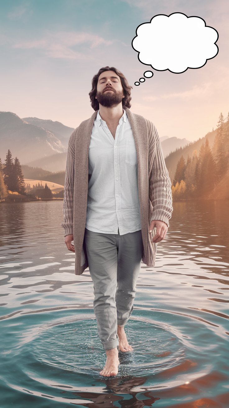 Der Prompt lautete: Erstelle ein fotorealistisches Bild, auf dem eines Mannes in einem modernen Casualoutfit, dessen Gesicht, Bart und Frisur bewusst an Jesus erinnern soll, und der barfuß auf dem Wasser eines schönen Sees spazieren geht (wie Jesus). Über seinem Kopf ist eine leere Gedankenblase. |