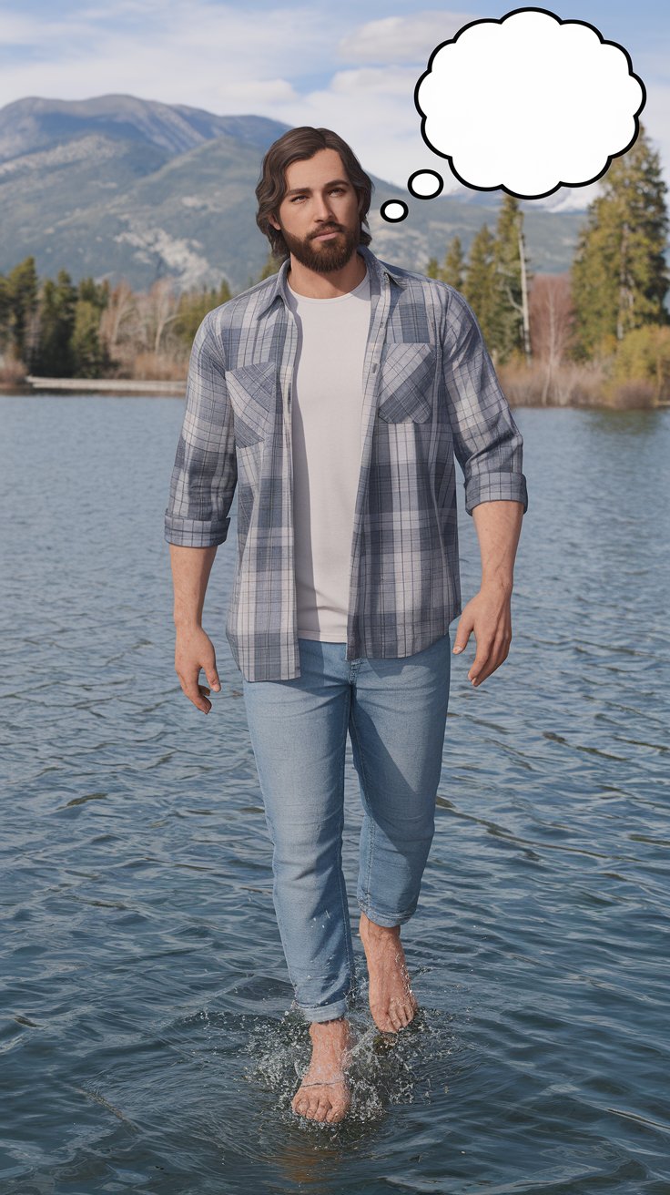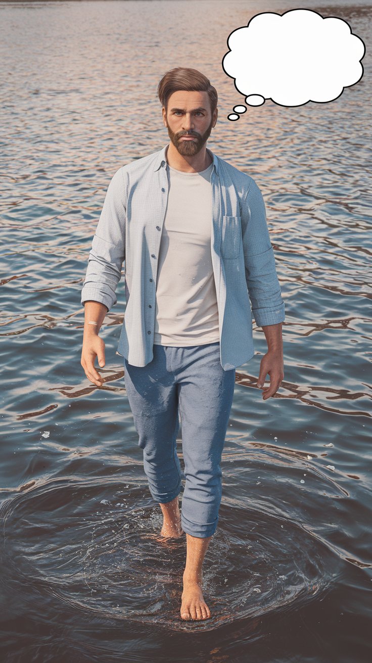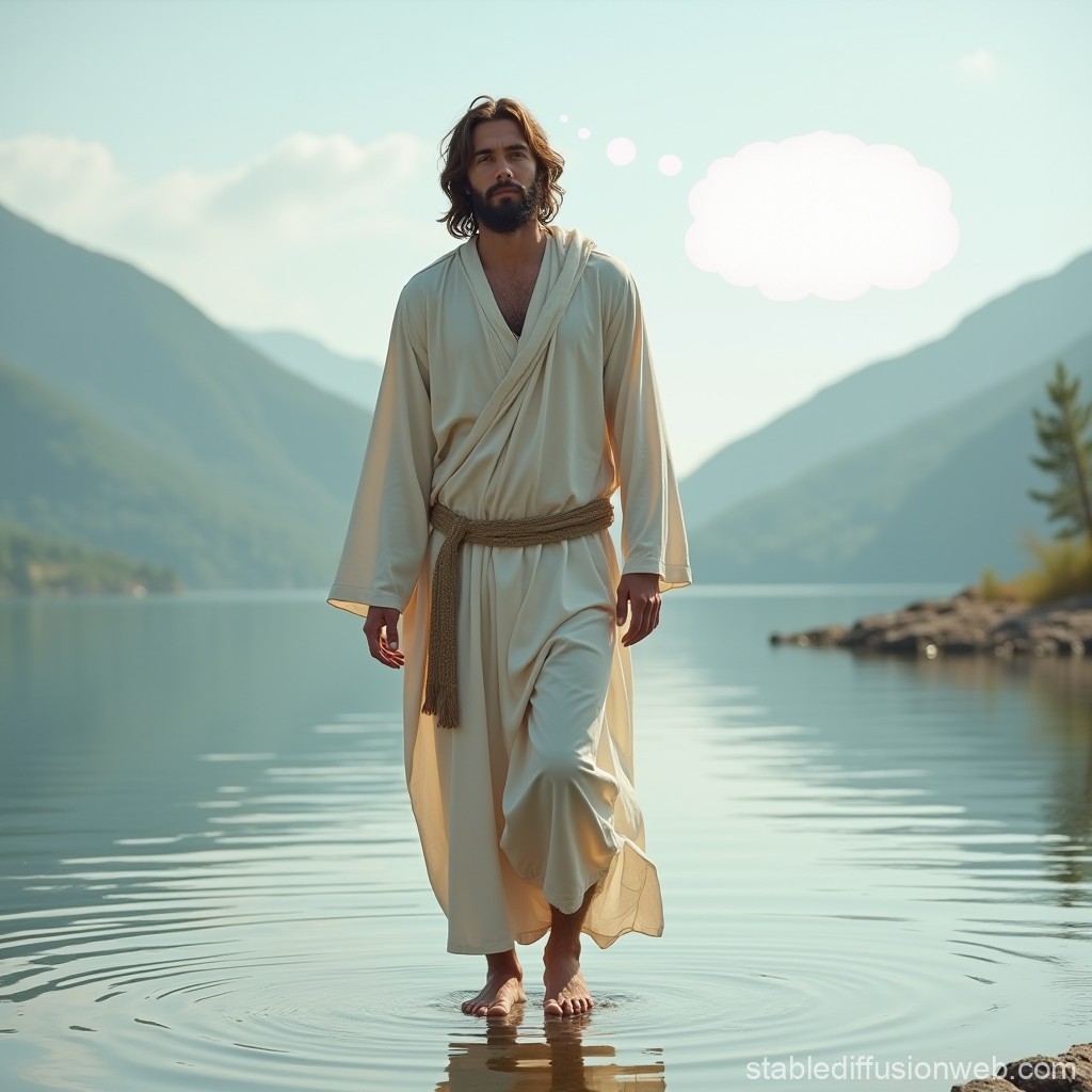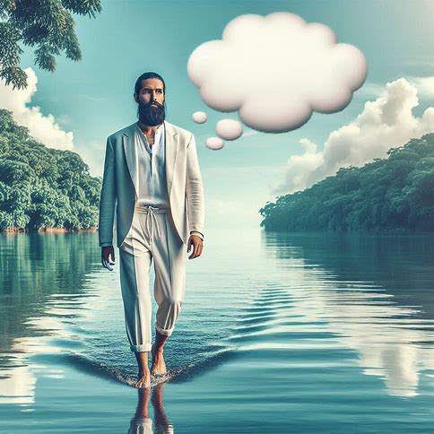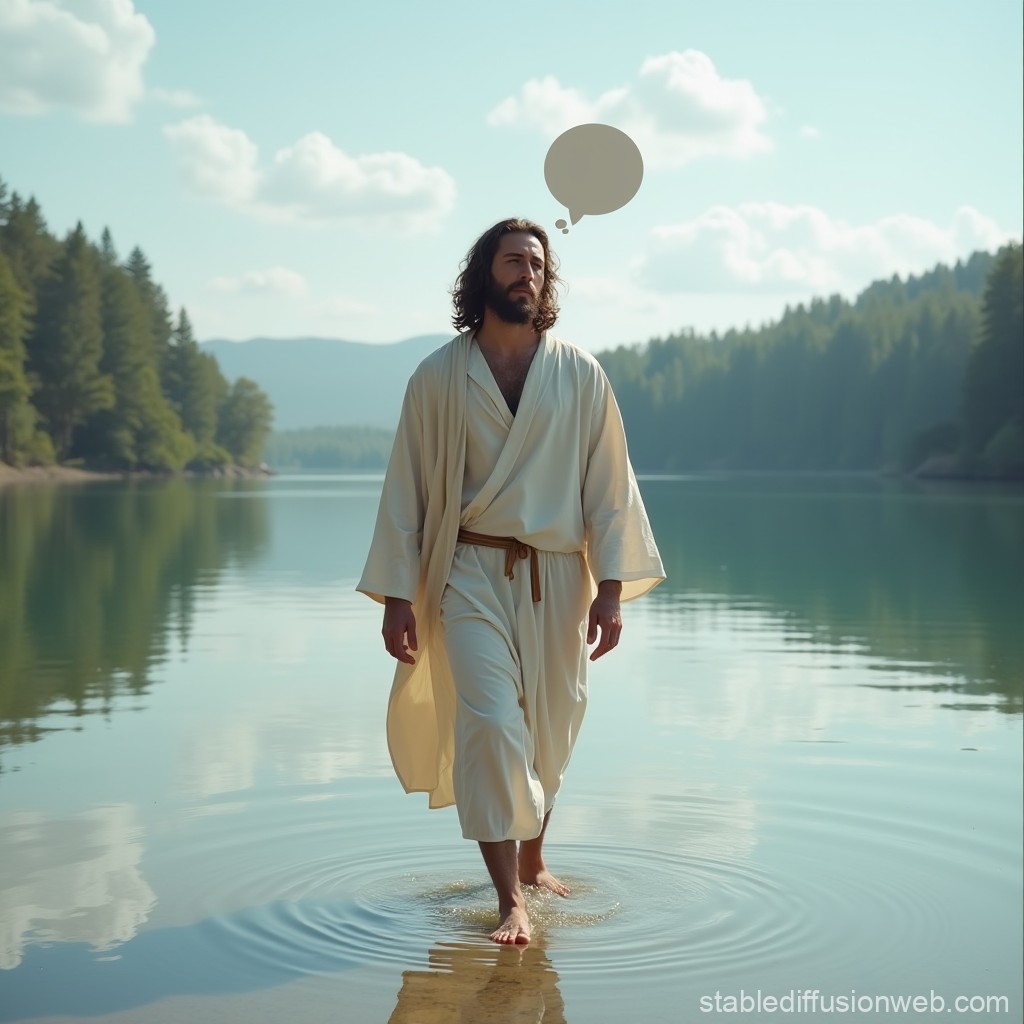 Der Prompt lautete: Erstelle ein fotorealistisches Bild, auf dem eines Mannes in einem modernen Casualoutfit, dessen Gesicht, Bart und Frisur bewusst an Jesus erinnern soll, und der barfuß auf dem Wasser eines schönen Sees spazieren geht (wie Jesus). Über seinem Kopf ist eine leere Gedankenblase. |